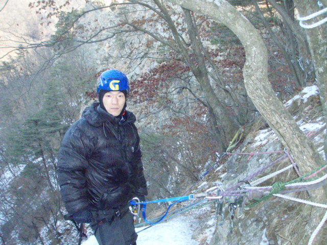 등반 자일 2동을 설치 후 하강하는 조규택 님
