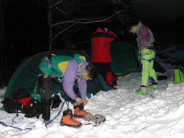 제목: 야간 빙벽등반을 하기 위해 준비 중