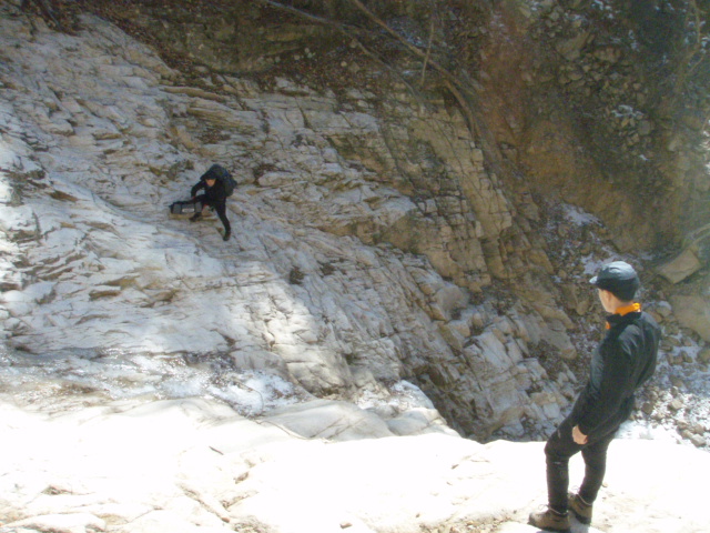 몸도 풀겸 실폭 야간등반을 한다 내려오는 한팀이 믿지 않이 한다