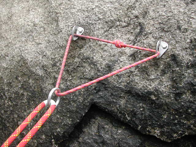 두줄 하강시에는 어느 한줄을 피톤 및 S.M.C링에 집어 넣은 후 다른 한줄과 매듭으로 연결한다