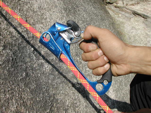 자일이 꼬이지 않도록 자일 두가닥 사이에 자신의 확보줄을 걸고 내려온다 4