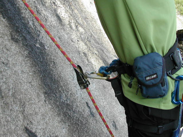 하강기를 자일에 설치 후 퀵도르로 벨트 세로 웨빙에 서로 연결한다 2