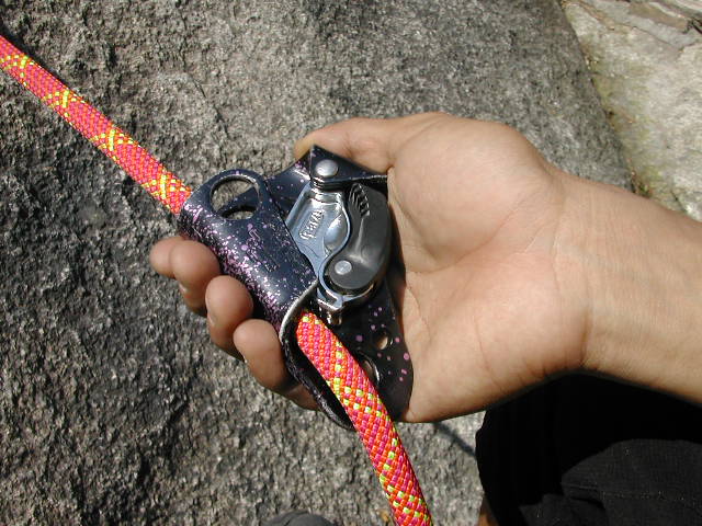 -90° 이하의 하강 설치법- 하강기를 자일에 설치 후 션트를 하강기 위쪽 자일에 설치하고 1